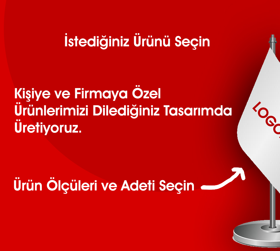 Bayrak boyutlarını sizin ihtiyaçlarınıza göre belirleyebiliriz. İhtiyacınıza göre küçük masa bayraklarından büyük dış mekan bayraklarına kadar her ölçüde üretim yapılmaktadır.